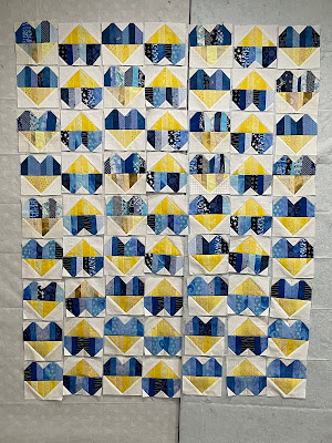 Since I had enough 'bottoms' for 8 hearts, I set about to make 'tops' for 8. This time I used grey for the accent piece. Why? It was on the 'sewing surface'...LOL I realized too late that I was going to turn half the heart tops upside down to add the corners but, it is what it is... I actually went into the blue scrap bin and found pieces that would 'work'. And I use the word, 'work' very loosely!