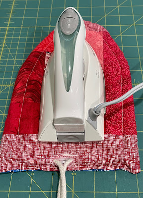 Third and last up: I made a cover for my small travel iron. It has a couple layers of Insul-Brite batting so it should be okay to unplug, cool a bit and then go. I first tried a fabric string but oh boy, I just couldn't feed that through the casing. Next, I tried a bit of clothesline. That was better but didn't fit the cord keeper I had brought. Sometime today, I'll stop in the craft store and pick up some paracord as that is what is called for in the pattern.